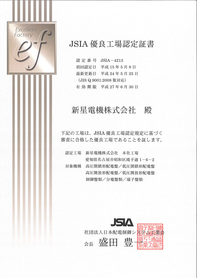 弊社は2003年5月、社団法人日本配電盤工業会より優良工場としてを認定されました。